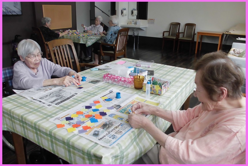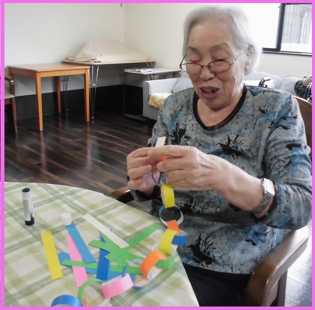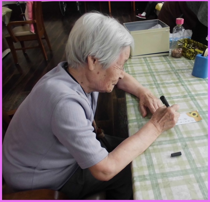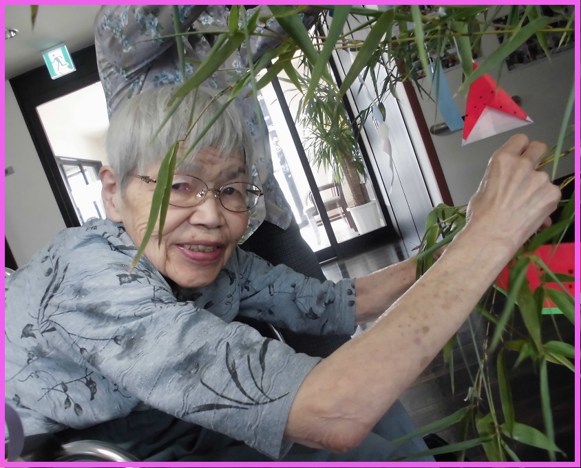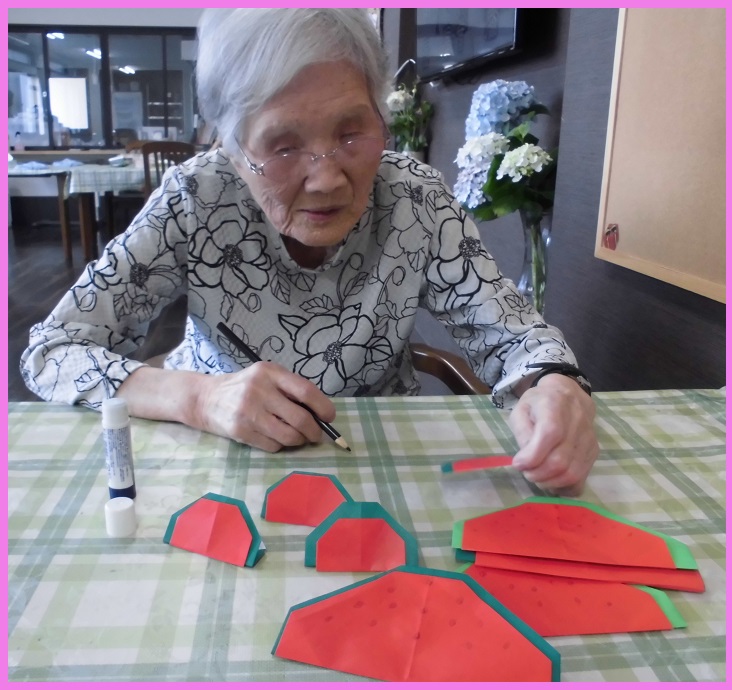 折り紙で可愛い飾りを沢山作ってくださいました。スイカの種も根気のいる作業です。集中して1粒1粒書いてくださいました。