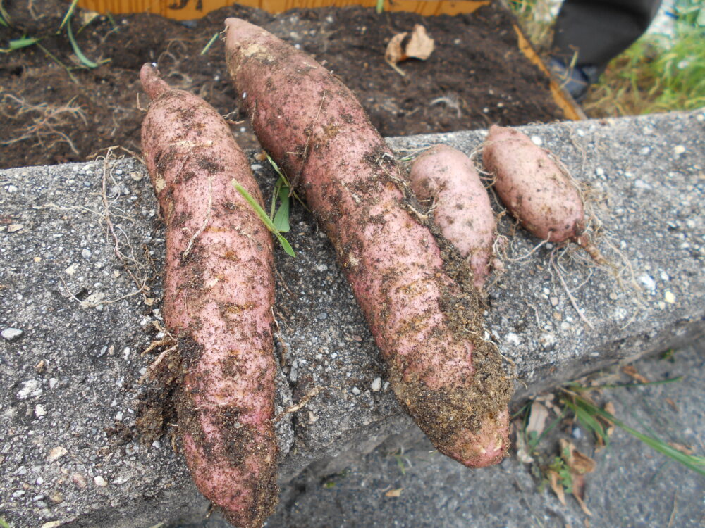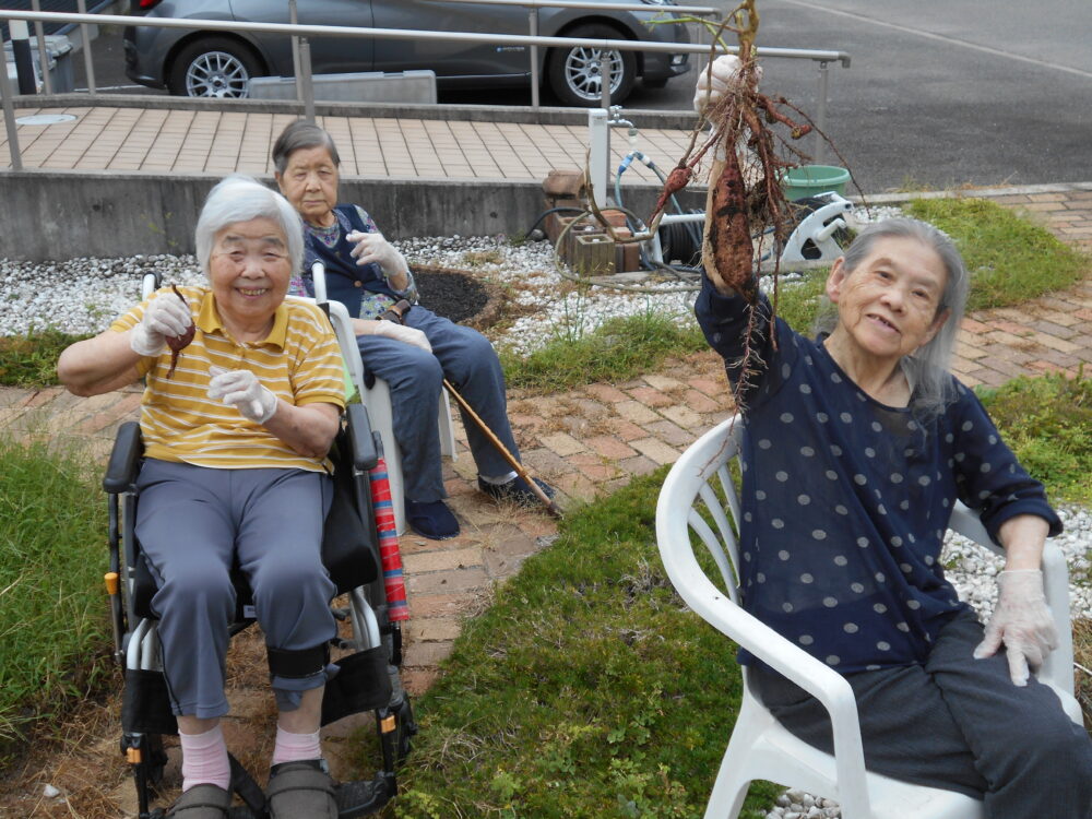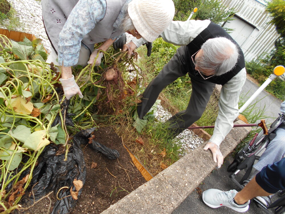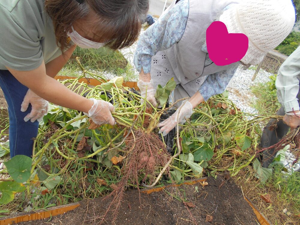 今日は、お庭で育てたサツマイモ掘りを
