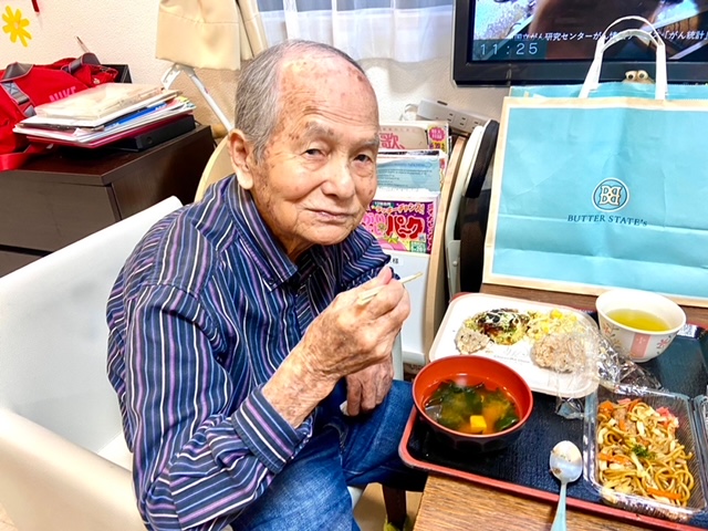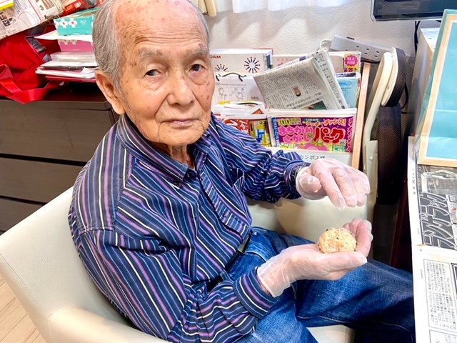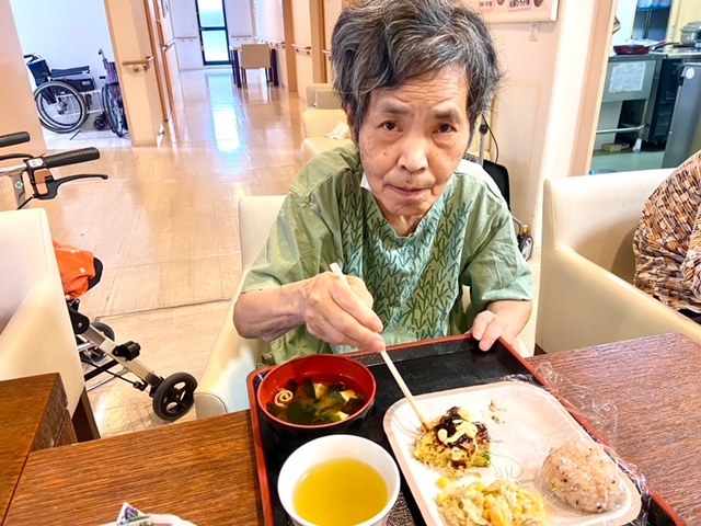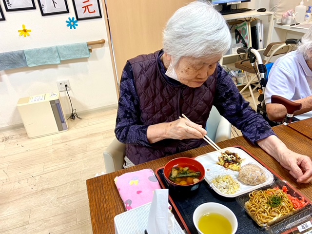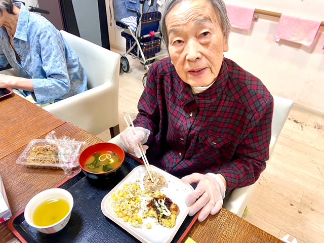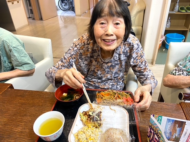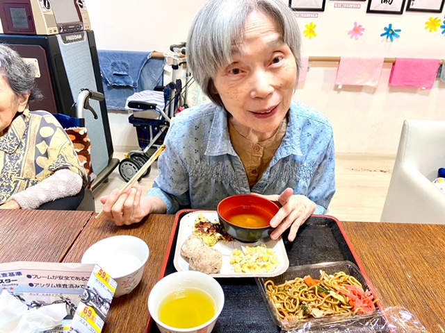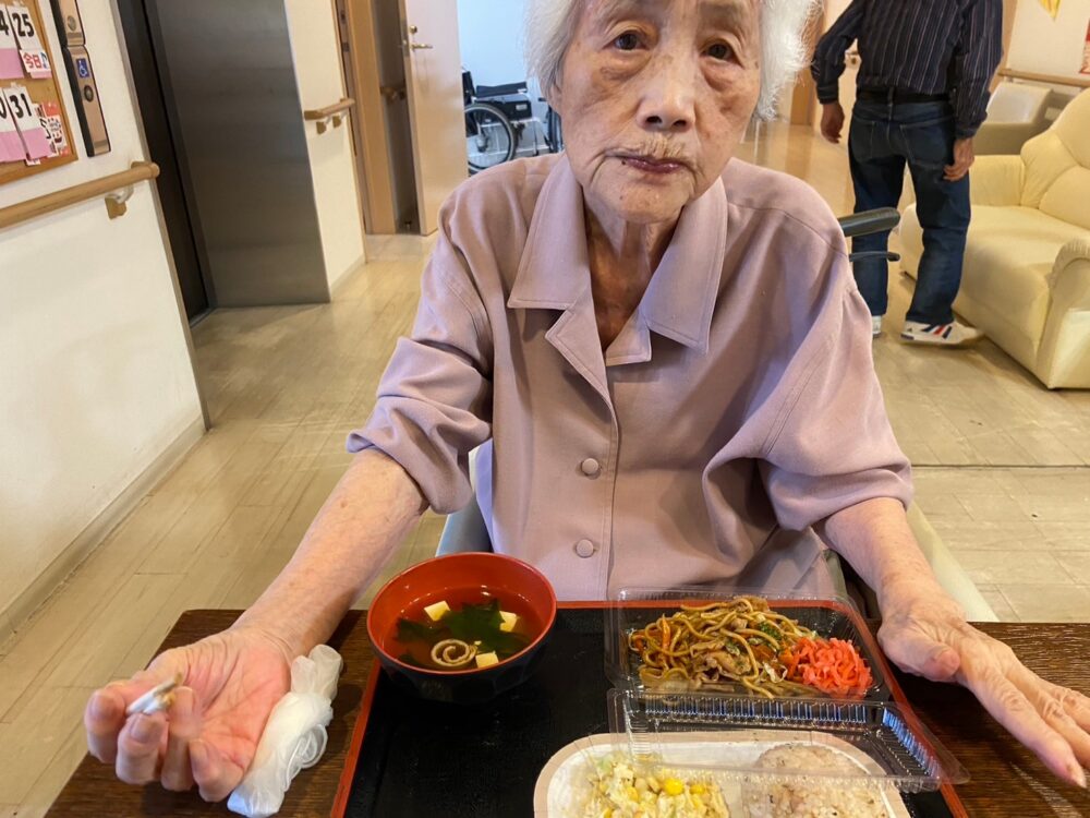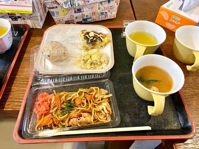 やきそばにおにぎり、サラダ、ミニお好み焼きと