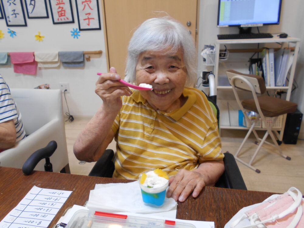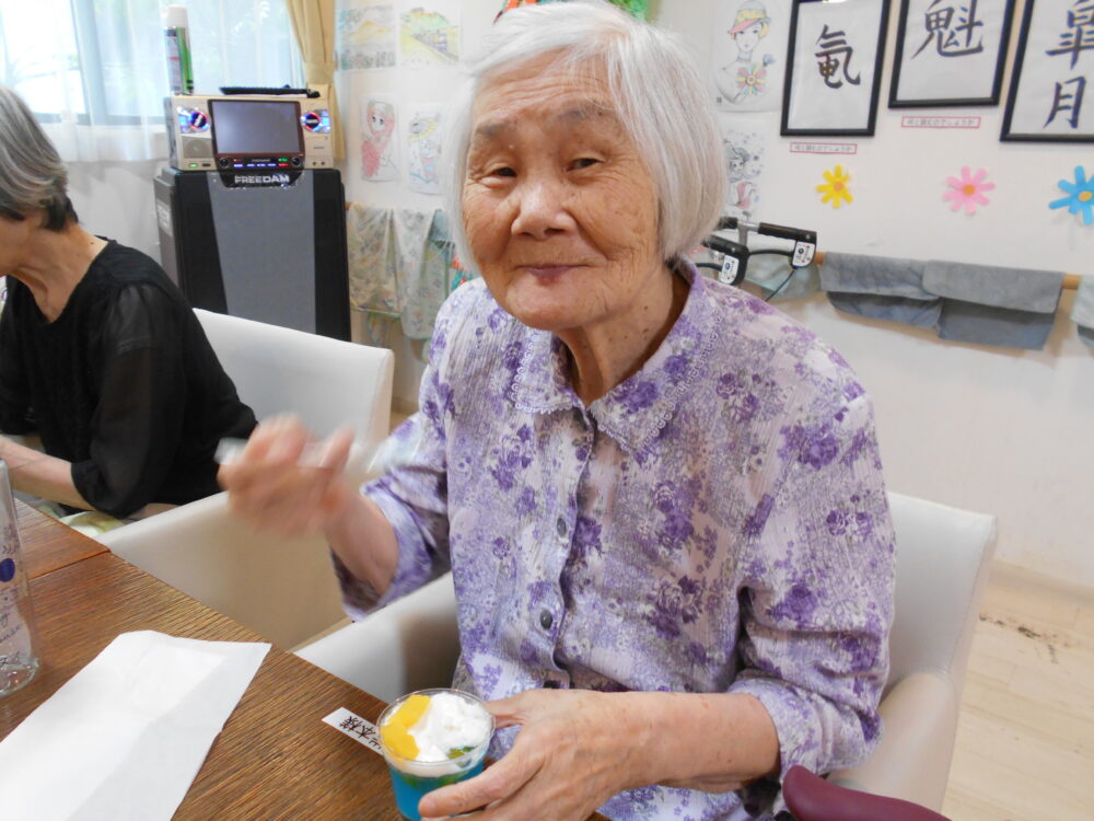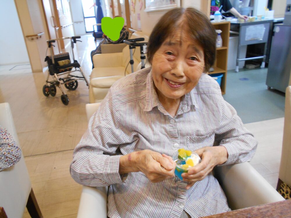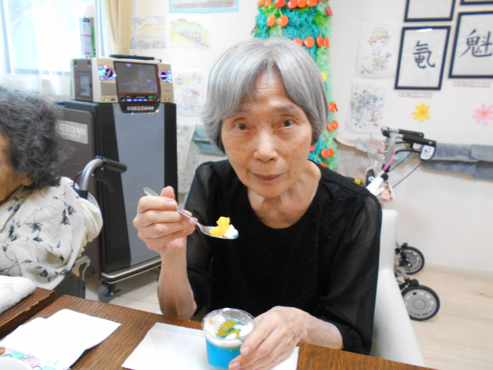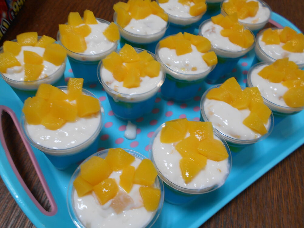 今日のおやつは、ブルーのゼリーに桃のフルーチェと桃を乗せて