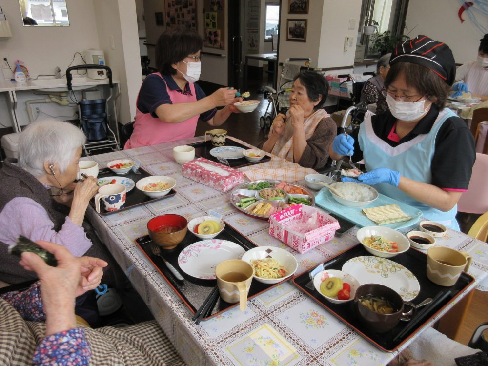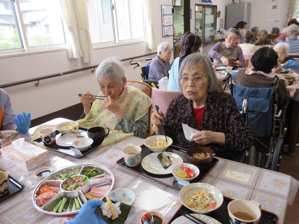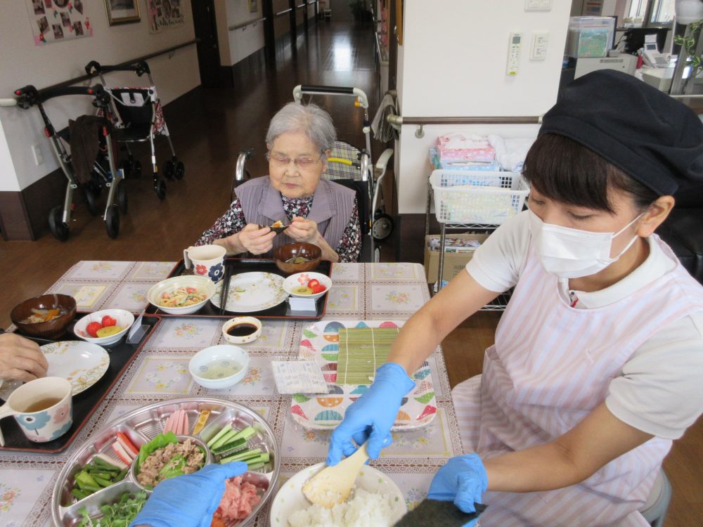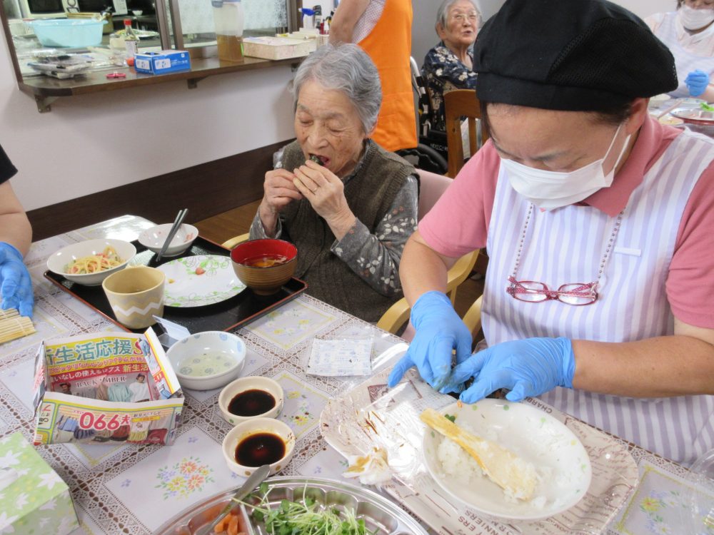 手巻き寿司・具沢山汁・スパゲッティサラダ・イチゴ・キュウイ