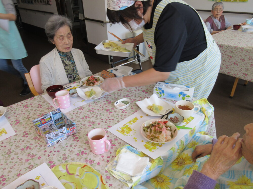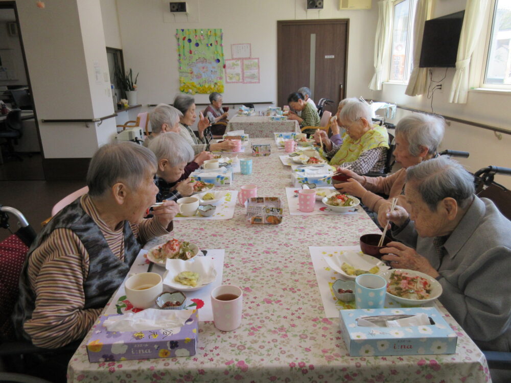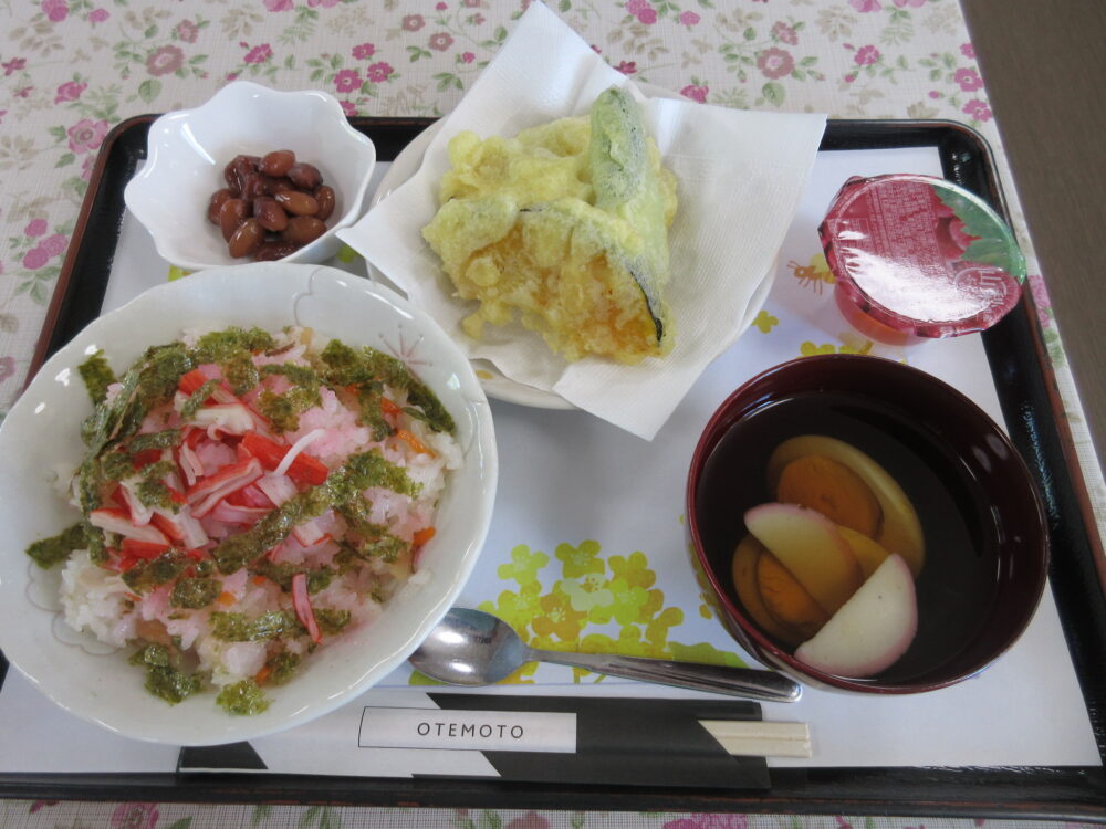 昼食は、ちらし寿司に揚げたての野菜天ぷら