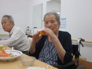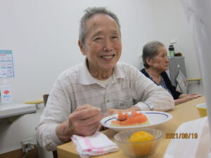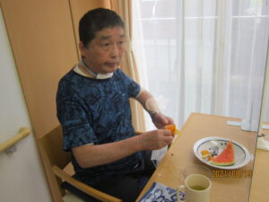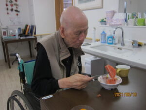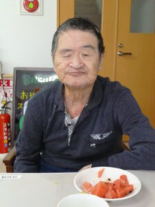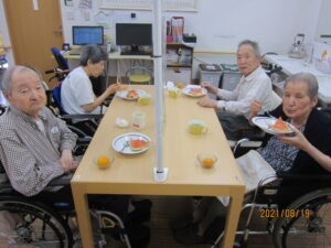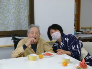 とっても協力的でお優しい利用者様に助けられ、盆踊り無事終了し、スイカとミカンをお配りして召し上がって頂きました(^^♪
