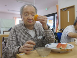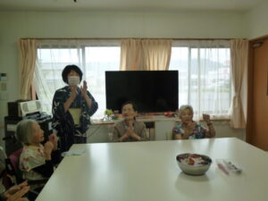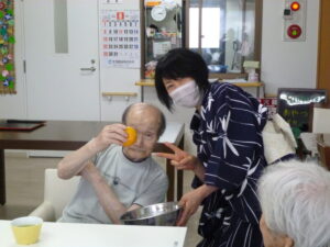 この時期にミカン!とってもおいしいかったです。最初はフルーツポンチを皆さんで作る予定でしたが、試しにうまくできるか家で試してみたところ、球体にスプーンで掬うことができず、器にする予定だったスイカが、まるでカブトムシに食べられたかのような悲惨な状態になってしまったため断念しました。切り分けて終わりにするのもつまらないので、イベント担当者浴衣を着用し、訪問に入る職員は魚河岸シャツを着ていただき、炭坑節を(座ったまま)踊ることにしました(^―^)