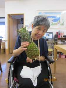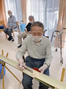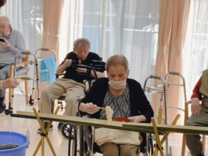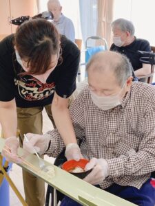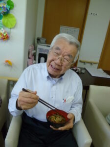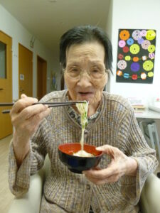 おつゆの薬味もショウガ、シソをお入れし、普段寒がりの男性の利用者様が、「まだ食べたい」とざるに落ちてしまった、取り損ねたそうめんやキュウリを拾おうとされる