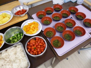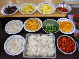 おそうめんの他に、フレッシュなパイナップル、オレンジ、缶詰の桃、ミカン、私の自宅で収穫したミニトマト、キュウリ、水ようかんを流しました(*^^*)