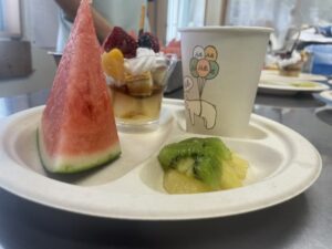 プリンアラモード🍮と、季節の果物のスイカ🍉とキウイ🥝も添えました