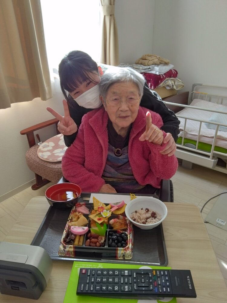 数の子、黒豆、伊達巻、職員が作っただし巻き卵など色々なを物を入れました。