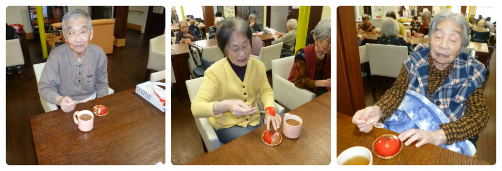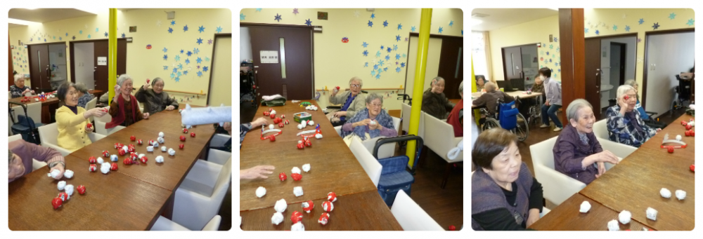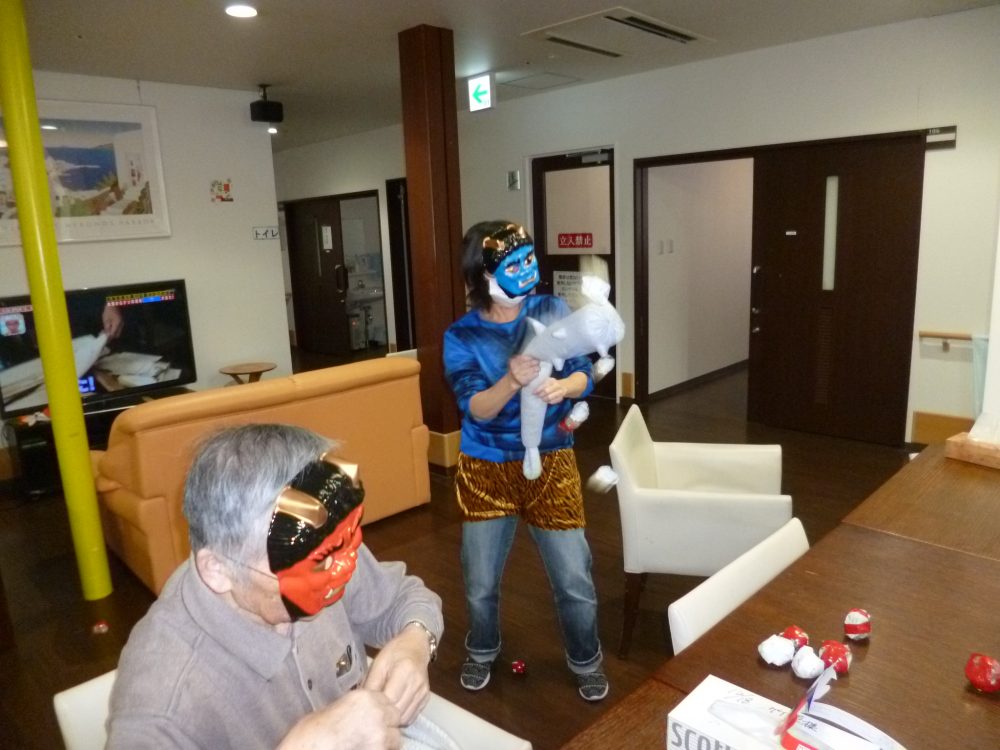 まずは、入居者の方に鬼のお面をつけて頂き、写真撮影しました。