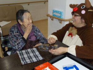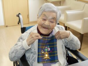 サンタさんにもらった巾着を一緒にデコレーションし、入居者さんは「ええのができた!」と