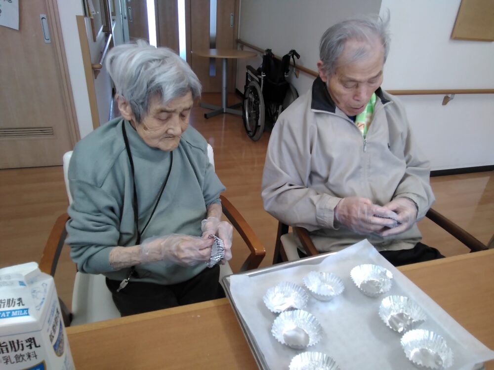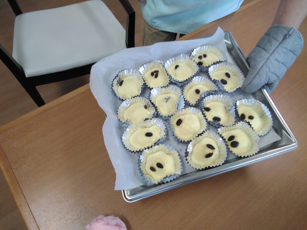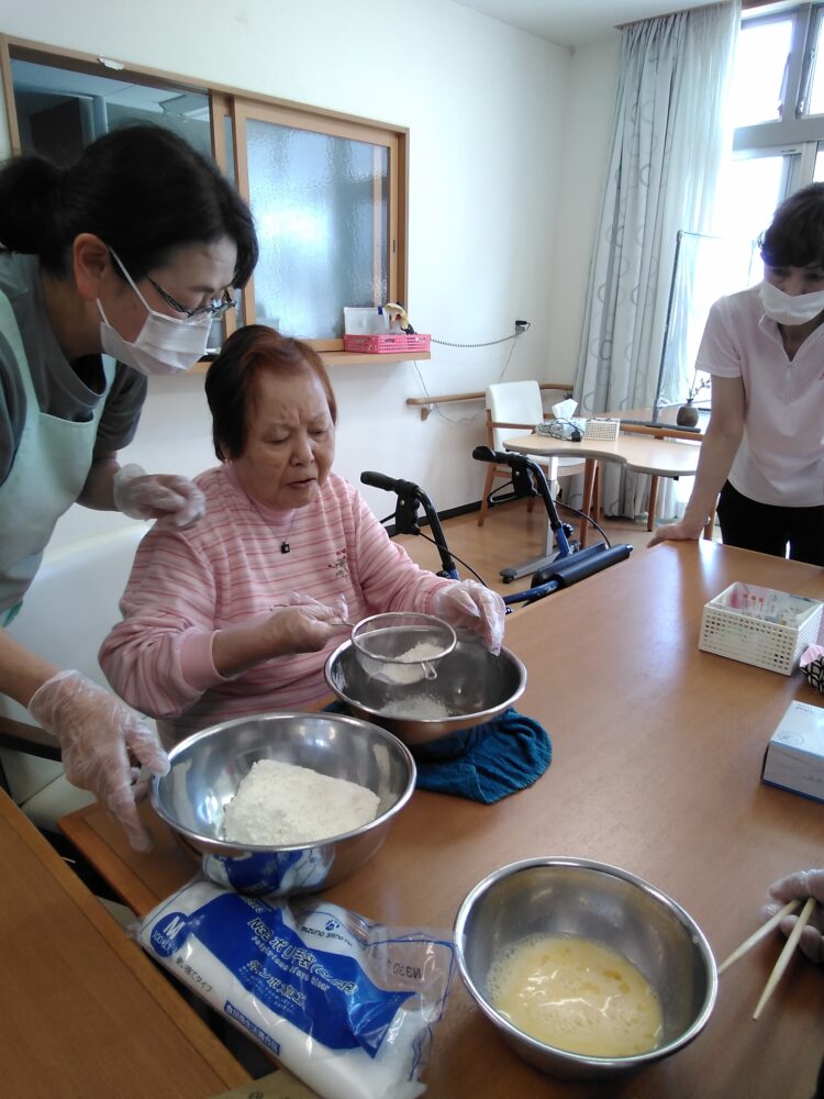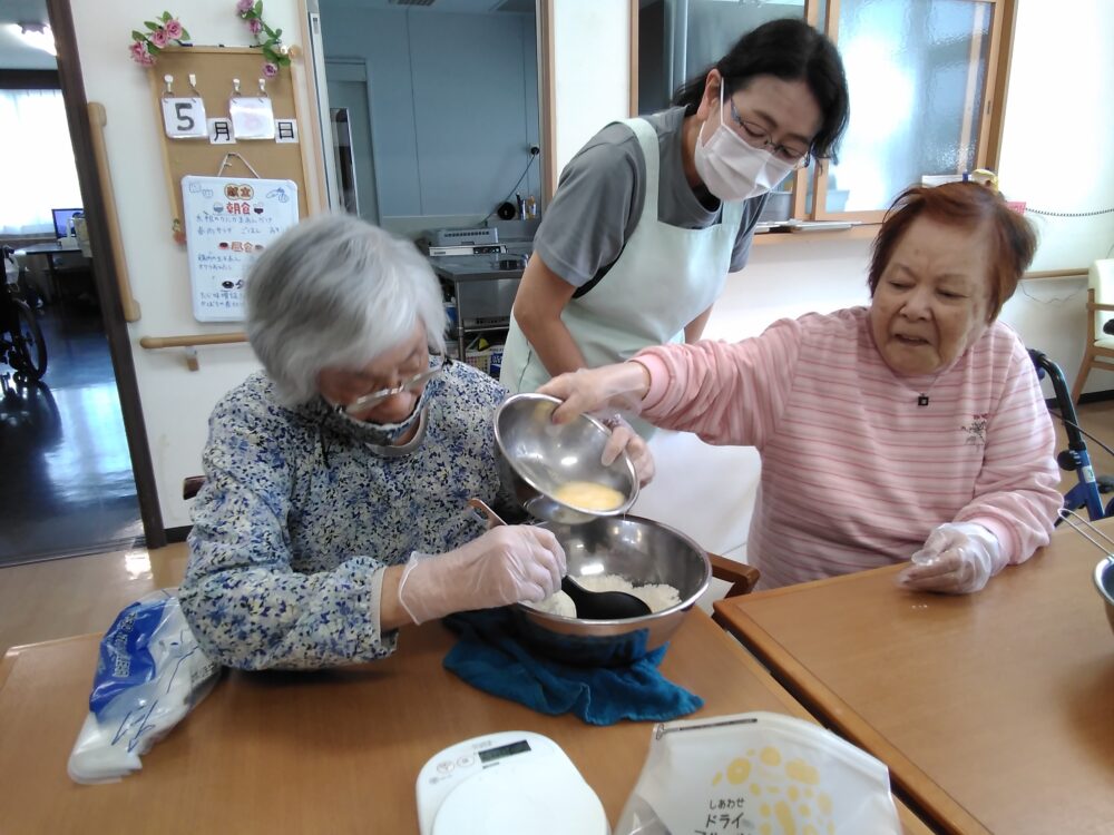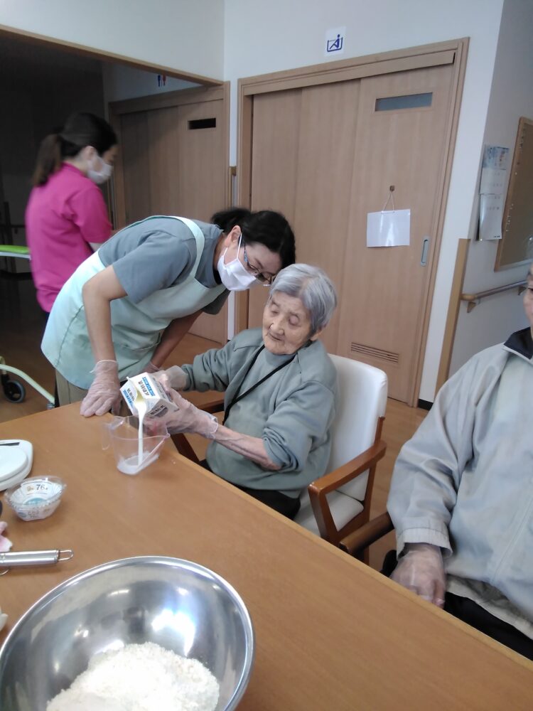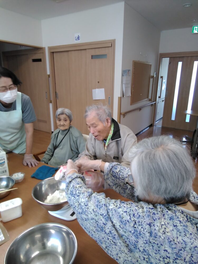 昼食の時に、「今日のおやつは蒸しパンを作りましょう」と、お声がけすると、