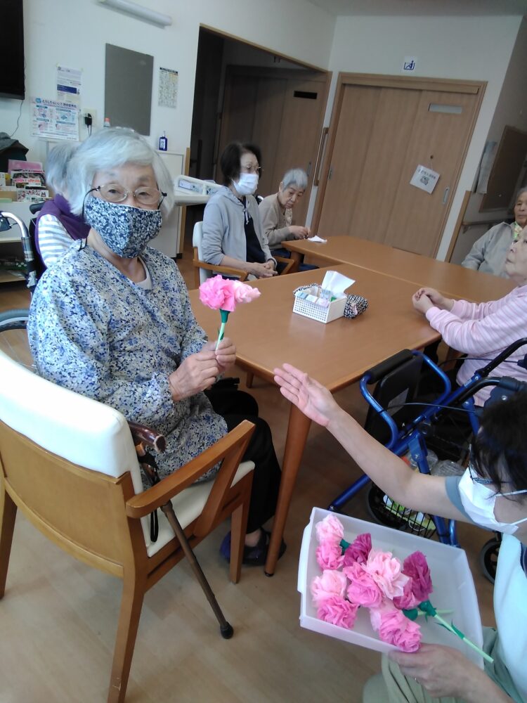 スタッフから日頃の感謝を込めて、手作りカーネーションをプレゼントさせて頂きました(*^-^*) 「キレイねぇ!」「ありがとう!」笑顔のお返しです