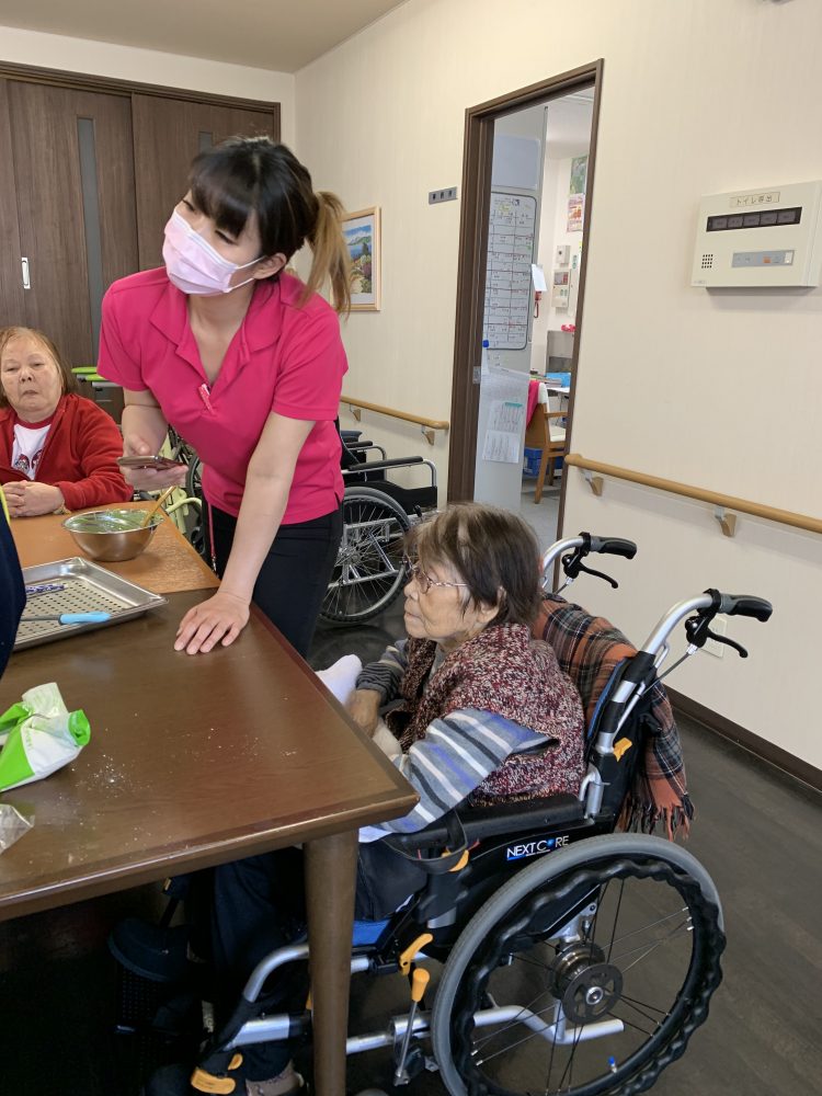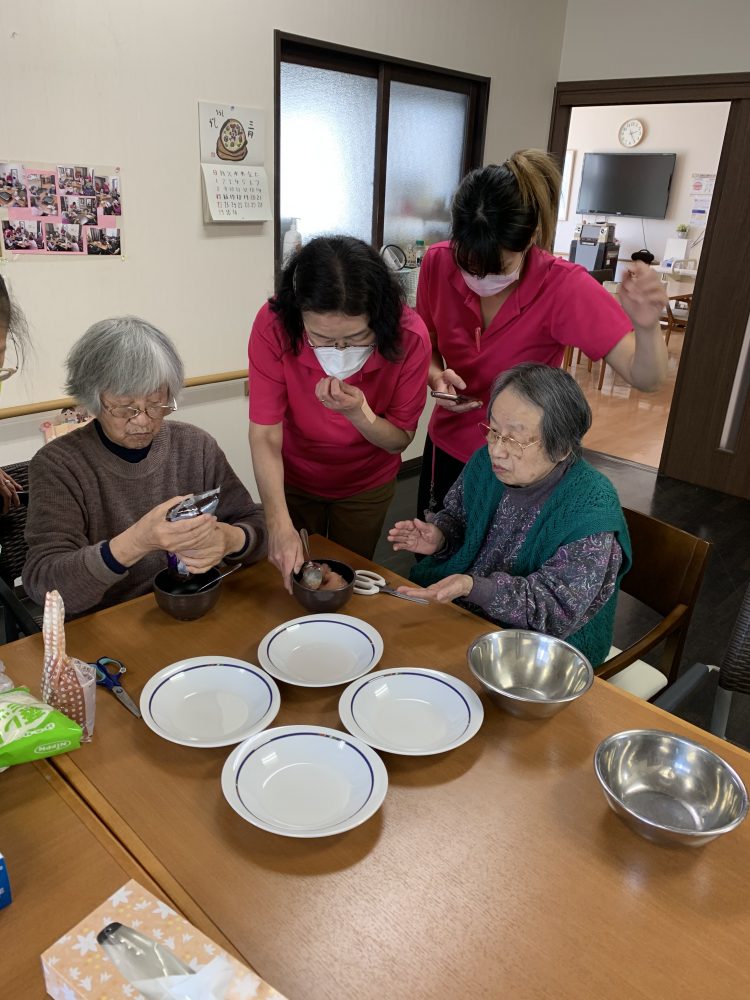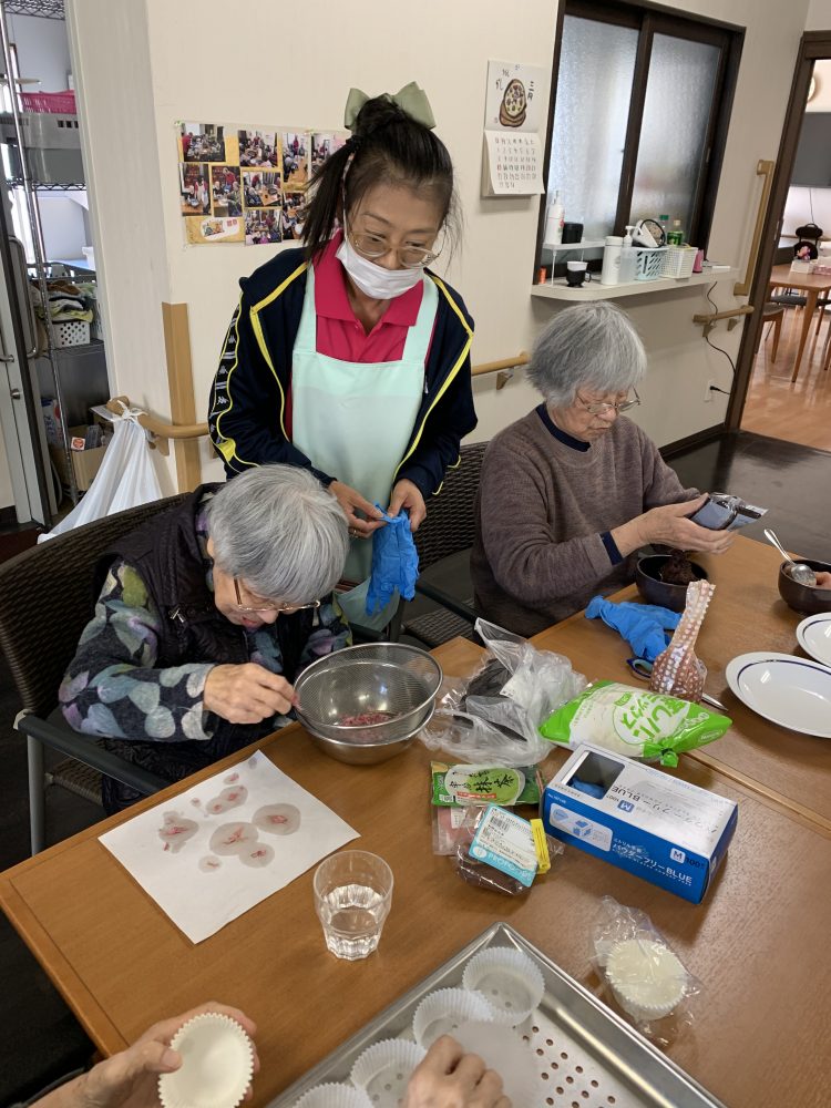 入居者様と一緒に手作りおやつを作り、これで第3回目になりますが、桜も抹茶も美味しいわよ~ってそれぞれ交換をしながら楽しんで食べていました。