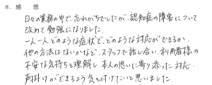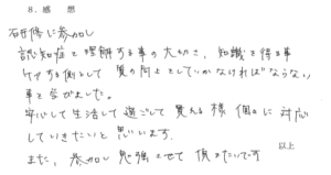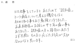 大阪からも参加してもらい認知症についての勉強をしました!!それぞれの職員が今までを思い返し、考え、行動して欲しいです。運営統轄本部長・柴田