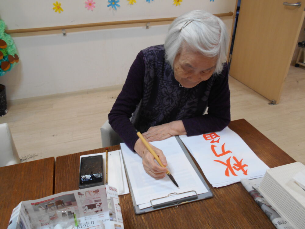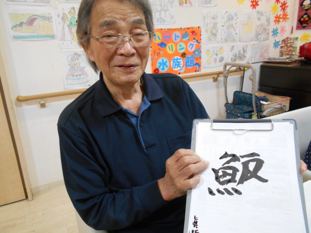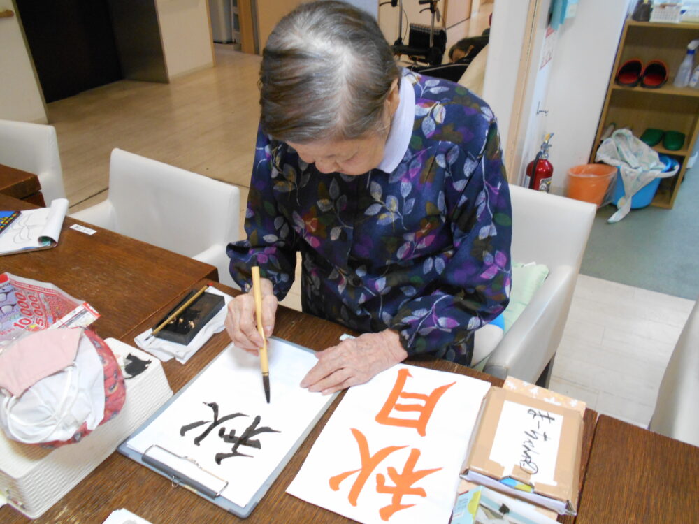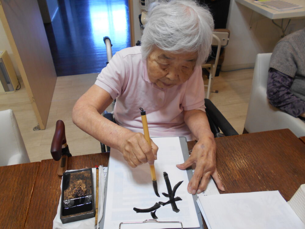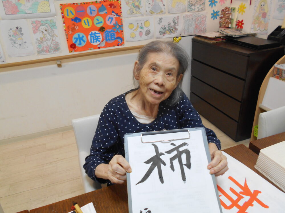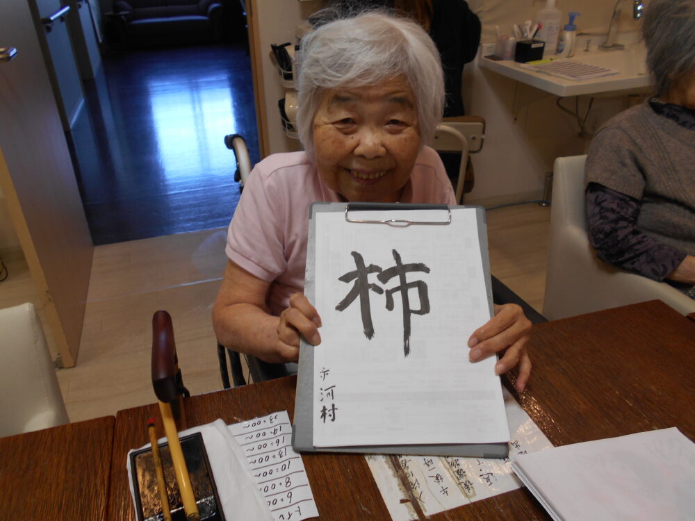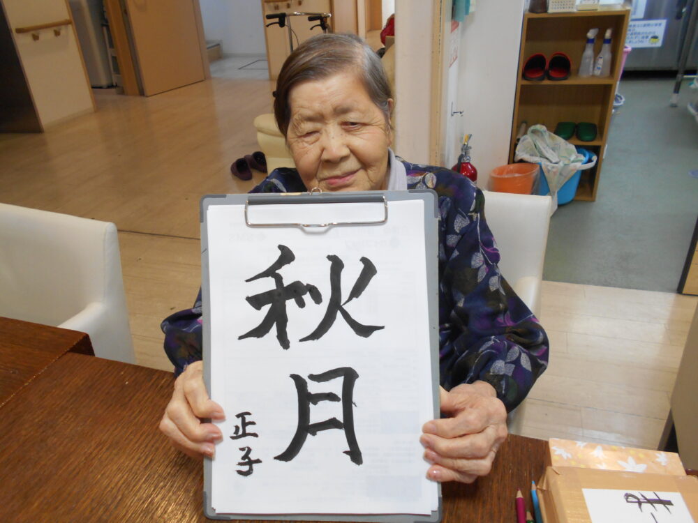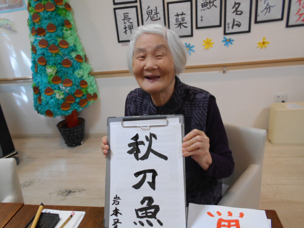 今月の書道を行い、「秋月」「秋刀魚」「柿」が