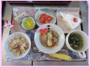 ・炊き込みご飯・肉じゃが・鯛のお吸い物(めでた~いぃ)・お新香・スイカ
