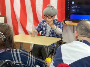 利用者様にご協力いただいた前座は、かつらをかぶり